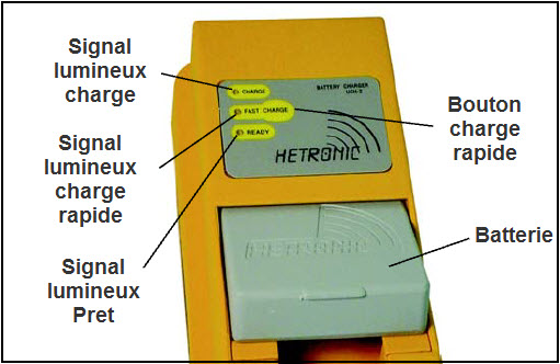 Quand la batterie est insérée dans le chargeur, une lumière clignotante de 'chargement' DEL s'allume. La fin du chargement est déterminée par la détection de la tension maximale de la batterie ou après 5 heures quand la lumière 'PRET' s'allume. Quand le clignotant 'PRET' s'allume, le chargeur continue de charger la batterie au goutte à goutte.