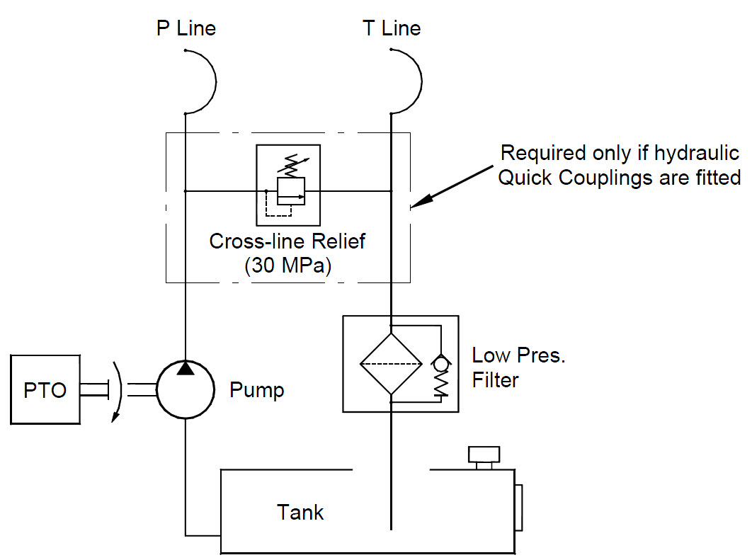 The truck speed control is required to be fitted with a governor that can be set to a particular rev range when the PTO pump is engaged. This will ensure that the correct oil flow can be achieved for the appropriate model (refer to model specific details). If the hydraulic supply is to be fitted with Quick Coupling connections i.e. cranes are to be demountable; the additional valve shown in Figure 1 will be required to protect the pump from over pressurising. Otherwise installing a pump with an integrated bypass relief will achieve this.