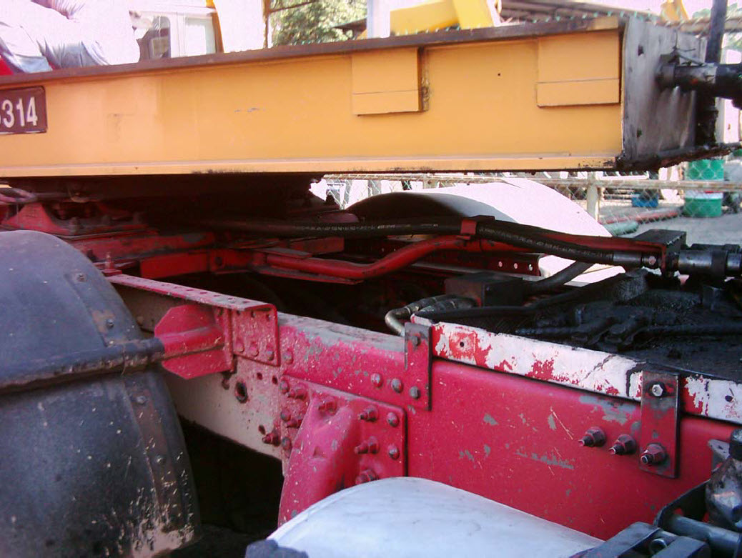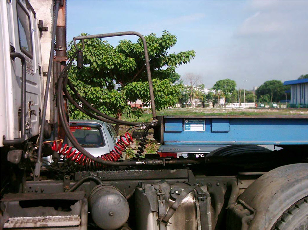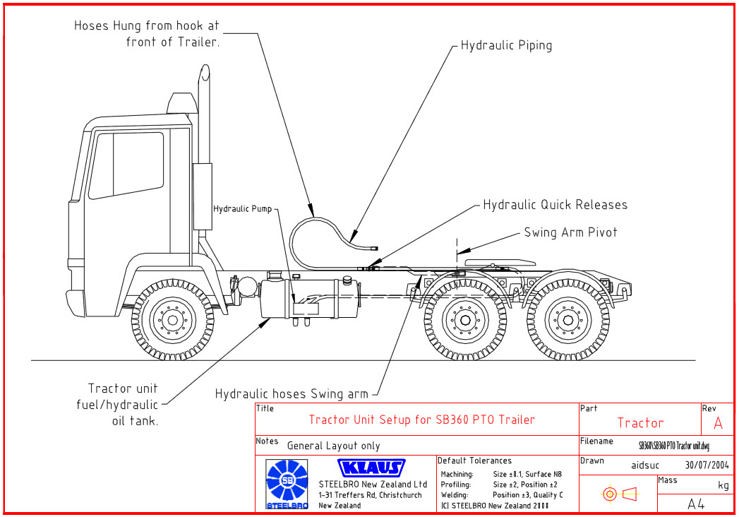 The hydraulic pipes should be run to layout drawn in Figure 2 and shown in Figure 3 and Figure 4. This layout performs well in the harsh conditions that the hoses will be put through. The circuit consists of the hydraulic hoses running from the hydraulic pump along the bottom of the tractor chassis until the hoses are behind the fifth wheel. The hoses are then looped to the top chassis. From this position they run underneath the fifth wheel and get connected to the Hydraulic hose swing arm. The swing arm keeps the hoses in a rigid state and allows the hoses to swing through the required arch without rubbing and catching on the trucks chassis and accessories.