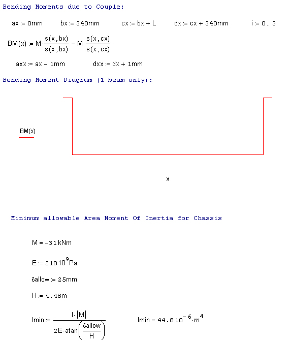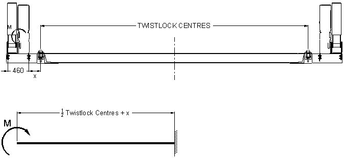 As the exact arrangement of supports will vary from installation to installation the following calculation has been carried out with assumptions i.e. consider the loads to be taken solely by one beam. The most critical aspect identified for proper crane operation is the amount of deflection allowed by the support frame/chassis. The following diagram considers only the opposing moment couples generated by the rolling of the cranes towards each other. From these we can determine the minimum chassis strength required to resist deflection if not taking axle supports into account.