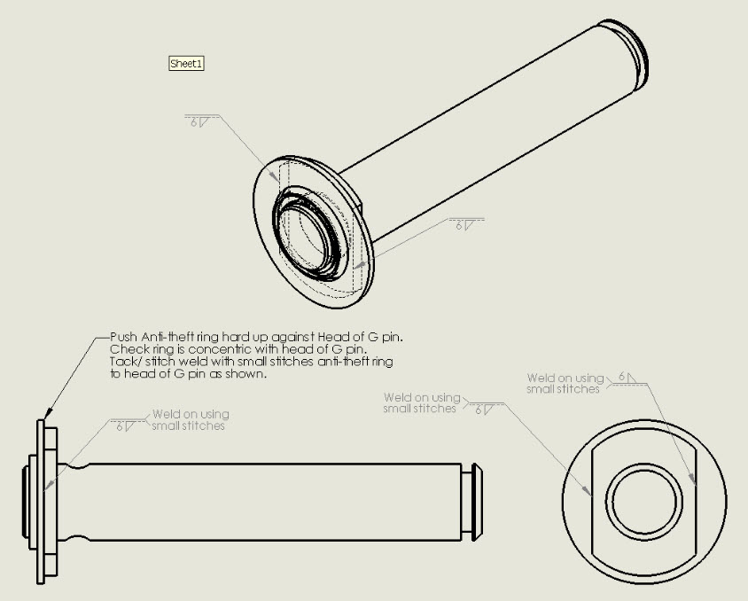- Clamp ring onto the head of the G pin as shown in figure 2, making sure ring is concentric to G pin shaft. Once clamped into position secure the ring to the head of the G pin using tacks or small stitch welds as shown in figure 2.