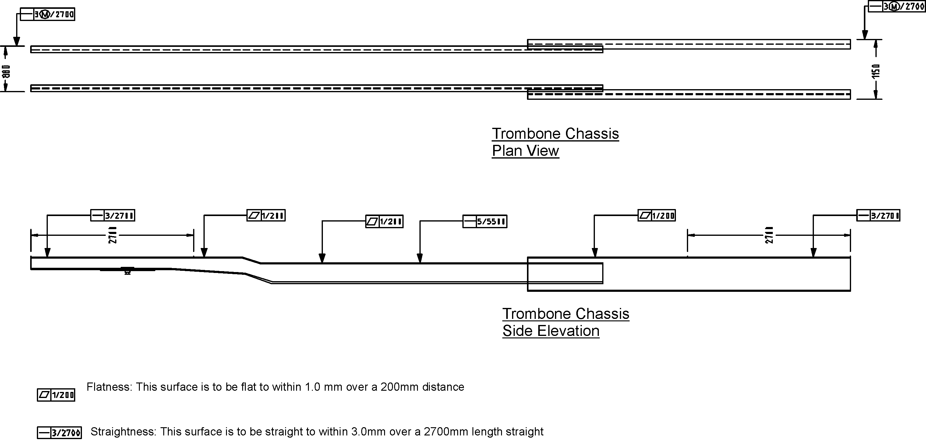 To allow correct movement of modules while traversing the following chassis dimensions/tolerances must be maintained after any repair work. This tolerance applies to the length of chassis traversed by the cranes, however normal structural requirements will determine the tolerances required over the remaining length of chassis.
