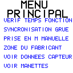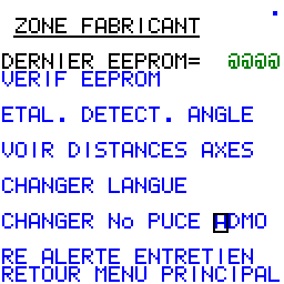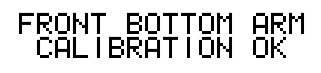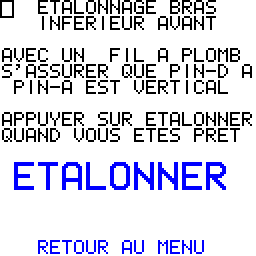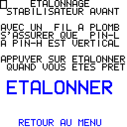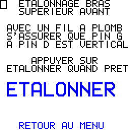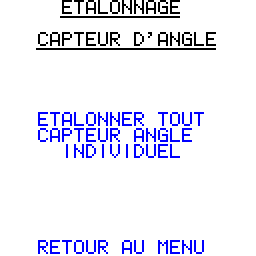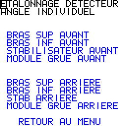 Une fois le châssis mis à niveau dans les deux sens et les grues complètement en position repliée S'ASSURER QUE LE MOTEUR DIESEL NE TOURNE PAS. Aller de 'Etalonnage de chaques capteurs d'angle' à 'Etalonnage de 'l'angle du module avant', puis sélectionner CALIBRATE et appuyer sur le bouton rotatif.