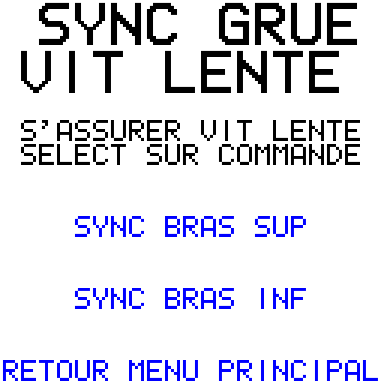 La synchronisation des grues est disponible en accédant au menu de l'affichage. La synchronisation est seulement effective lorsque Vitesse lente est sélectionné sur la commande à distance.