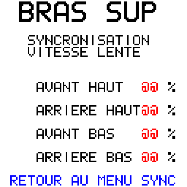 Si le timing de l'une ou des deux grues ne correspond pas au tableau ci-dessus, vous devrez ajuster les valeurs en pourcentage sur l'écran jusqu'à ce que cela corresponde. Pour ceci, sélectionner la fonction appropriée en tournant le bouton puis en appuyant. Vous pouvez alors ajuster la valeur en tournant le bouton d'un côté ou de l'autre puis conserver la nouvelle valeur en appuyant encore sur le bouton.