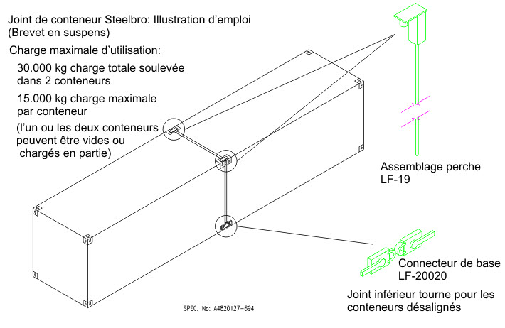 Le connecteurs de conteneur parfois sont également appelés des joints de conteneur ou des maillons de sécurité. Ils permettent à l'opérateur de soulever 2 x conteneurs de 20 pieds sur et à partir de la remorque en connectant leurs coins en about ensemble.