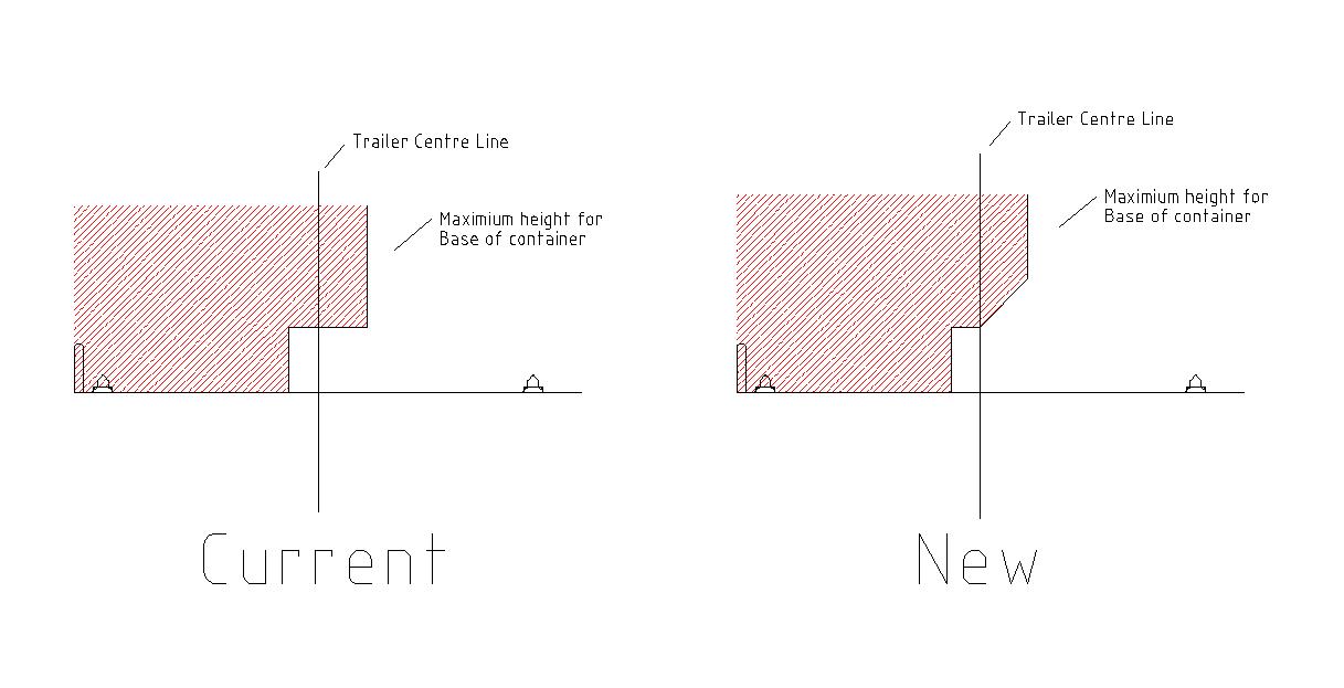 With the new geometry of the SB362 it has become easier to exceed the height set point when loading containers. This has resulted in the alarm being triggered more often resulting in time wasted in loading and unloading containers. The new control strategy now incorporates an approach angle which allows more height to be used the further away from the centre line of the trailer the container is.