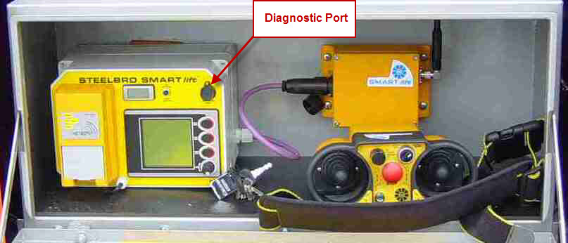 With the SMARTlift system 'ON' and the diesel engine running, plug the Downloading Tool (EL-34366) between the SMARTlift Diagnostic Port and PC USB port.
