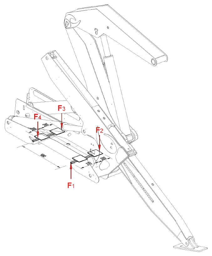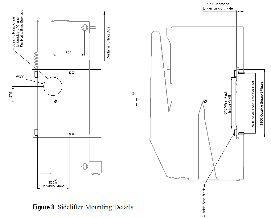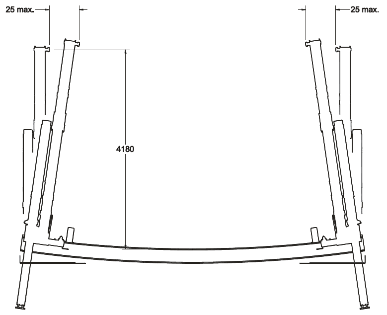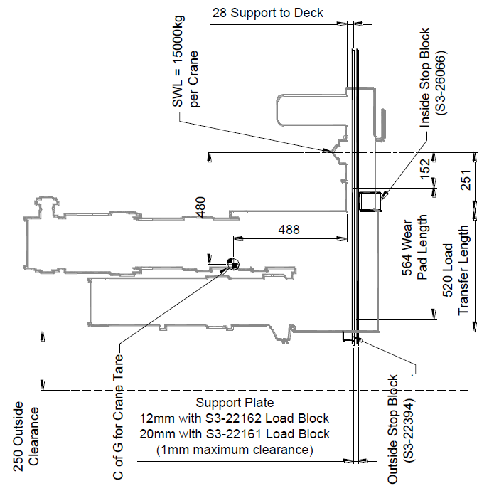 The design of the support frame or chassis is required to be stiff enough to prevent excessive deflection at the lifting pin (G Pin) on the crane. As long as the deflection at each crane due to the loads specified above, does not exceed 25mm at a height of 4180 above the support flange, then the correct operation of these units will be ensured.