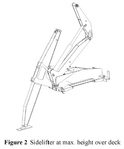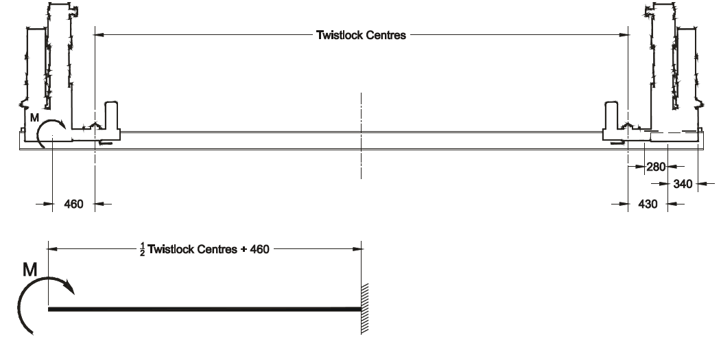 When the load is lifted to maximum height directly above the deck.This produces the greatest amount of out-of-plane moment on the arms, causing the cranes to roll towards each other. The weight of the payload and the cranes is also fully bearing on the supports at this point. The load on the stabiliser leg is negligible. The mounting chassis/frame is required to be stiff enough to prevent these deflecting too far, causing the lifting pins or chains to contact the upper edges of the container. |