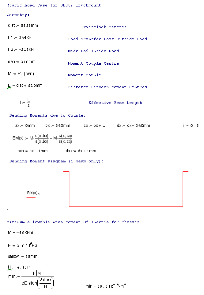As the exact arrangement of supports will vary from installation to installation the following calculation has been carried out with assumptions i.e. consider the loads to be taken solely by one beam. The most critical aspect identified for proper crane operation is the amount of deflection allowed by the support frame/chassis. The following diagram considers only the opposing moment couples generated by the rolling of the cranes towards each other. From these we can determine the minimum chassis strength required to resist deflection if not taking axle supports into account.