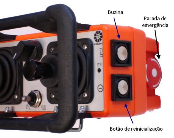 Pressione para parar todas as operações. Para reiniciar as operações, o botão de parada de emergência deverá ser girado no sentido horário para liberá-lo. |