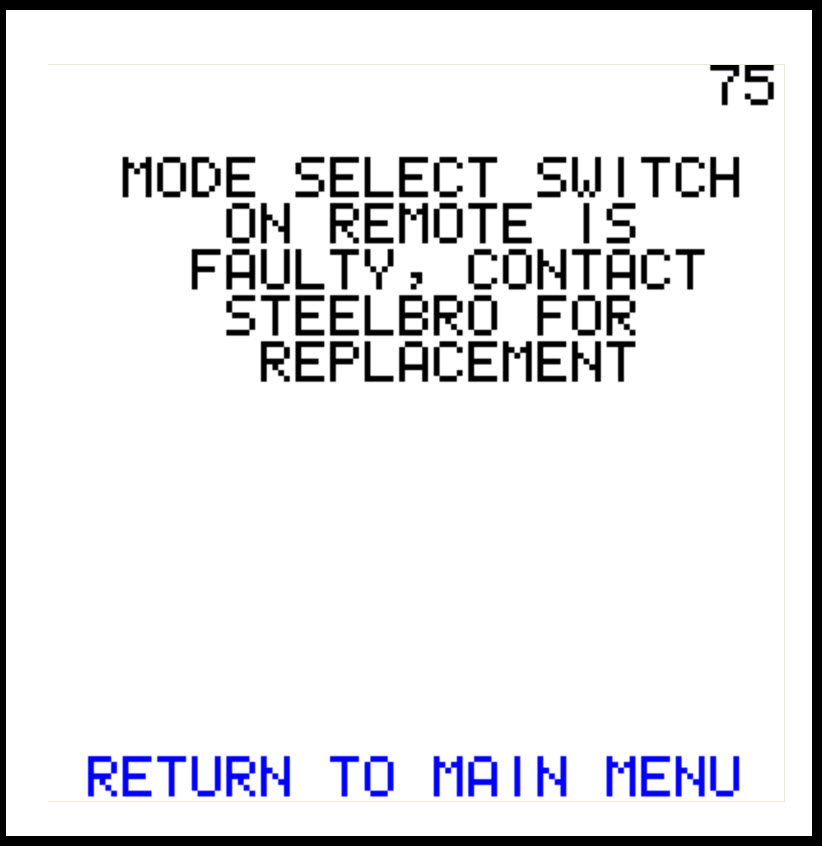 Go to VIEW JOYSTICKS on the Main Menu and check the mode changes as the mode switch on the remote is rotated. The switch has a stop pin that prevents unused modes being selected