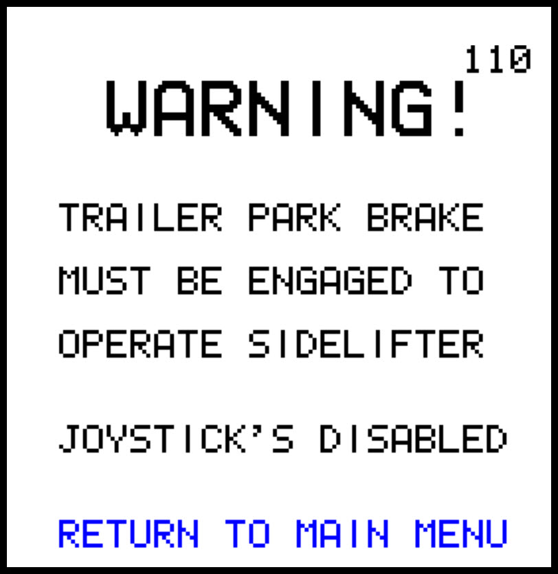 This is an optional feature for customers who wish to prevent the operation of the Sidelifter until the park brake has been engaged. An additional sensor is added to the brake circuit. This message is displayed if the operator attempts to operate the Sidelifter without the Park Brake ON. |