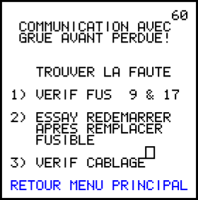 L'ECU de la grue arrière a perdu toute communication avec l'ECU de la grue avant.