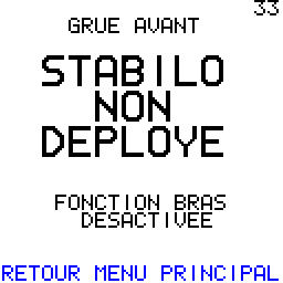 Le mode bras a été entré sans que le stabilisateur soit correctement déployé, c'est à dire sans qu'il y ait assez de pression mise sur le pied du stabilisateur pour fermer l'ouverture entre l'extension du stabilisateur et le logement du stabilisateur, activant ainsi le micro-disjoncteur du stabilisateur abaissé.