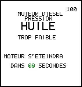 - Si le fil ORANGE qui va au sélecteur de pression d'huile est continue avec le fil de terre lorsque le moteur tourne (c'est à dire lorsque la tension fournie est supérieure à 13volts) alors cette page à l'écran apparaîtra.