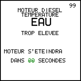 - Si la température d'eau du moteur est trop élevée ce message apparaîtra à l'écran et l'autochargeuse s'éteindra après 20 secondes pour protéger le moteur.