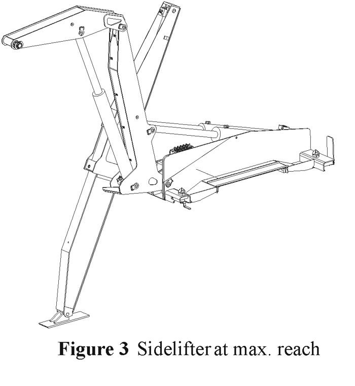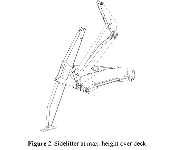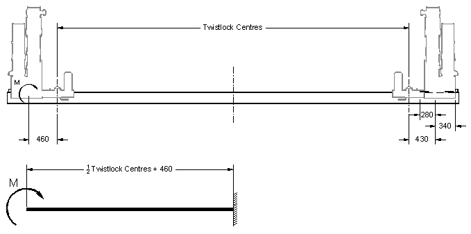 dans ce cas, les bras sont déployés au maximum et il s'agit d'un moment de battement hors plan. Les deux grues oscillent l'une vers l'autre. Ici, ce sont les supports qui recoivent le poids de la charge utile et celui des grues. Quant au poids sur le stabisateur, il est négligable. La structure du châssis doit être assez robuste pour empêcher une cambrure trop prononcée ce qui causerait les broches de levage ou les chaînes d'entrer en contact avec les coins supérieurs du conteneur.