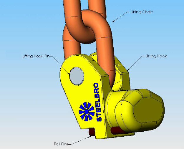 The lifting hook pins are an alloy steel, which is heat treated to produce a high strength material. These pins are strong but not malleable and will not tolerate large amounts of deflection. The pins should not freely rotate due to the roll pin locking mechanism used however the chain should be free to move around the pin.